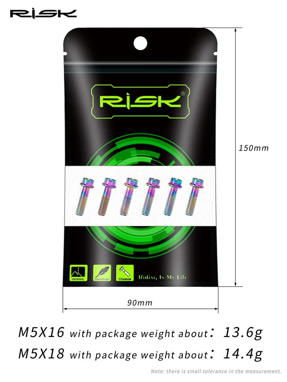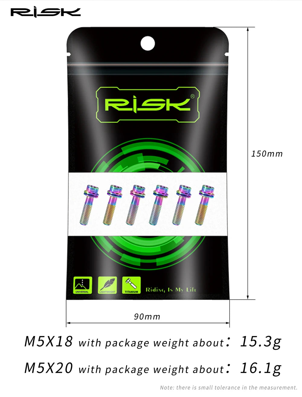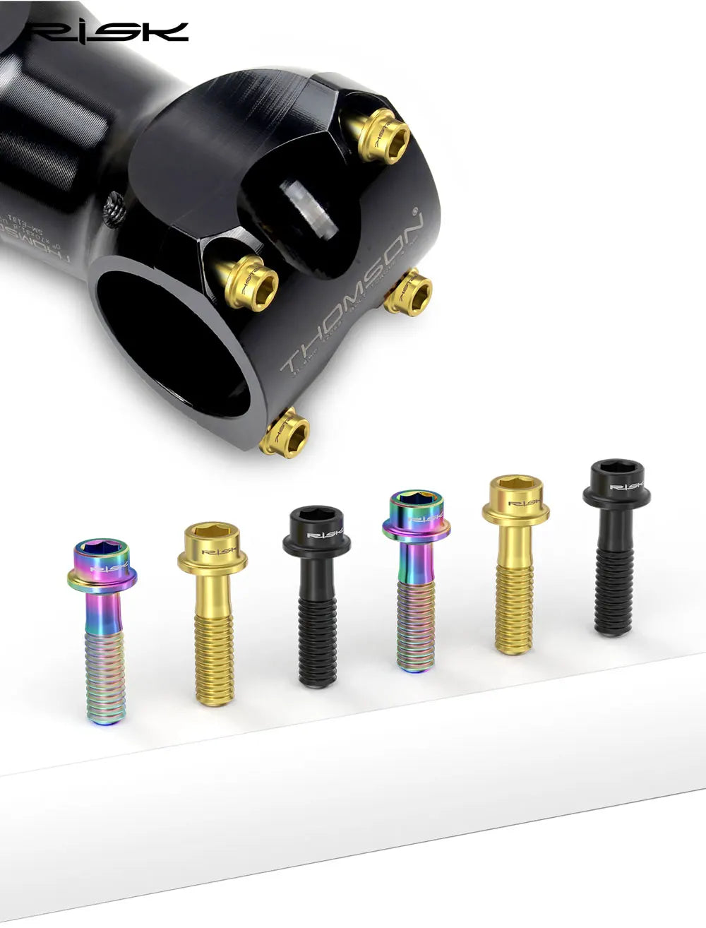 Precision-engineered RISK Bike Stem Bolts crafted from lightweight titanium alloy for superior strength-to-weight ratio. This 6-piece set includes M5x16, M5x18, and M5X20 sizes with washers and hex socket heads, ensuring secure handlebar attachment while reducing overall bike weight. Ideal for cyclists seeking performance-oriented hardware upgrades for their bicycle components.