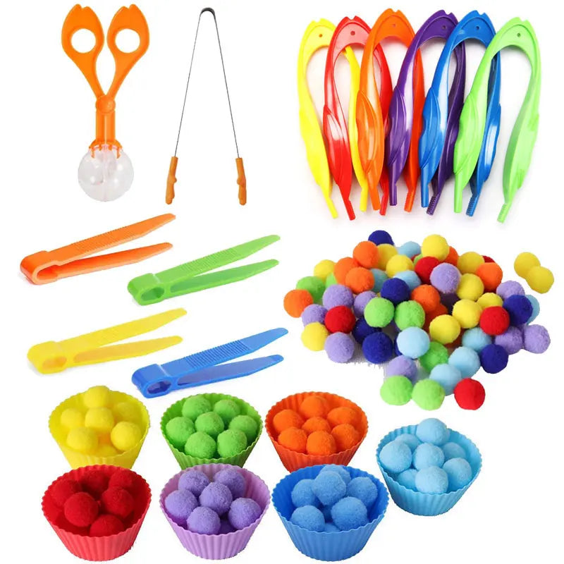 Children Fine Motor Skills Learning Counting Rainbow Pompoms Sorting Games Montessori Early Education Toy with Tweezers for Kids