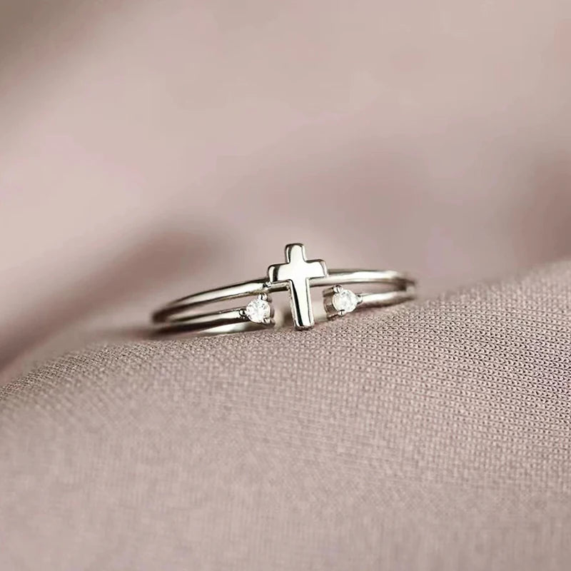 Chic Dainty Silver Color Cross Ring Female Fashion Finger Jewelry with Bright Cubic Zirconia Accessories for Daily Wear