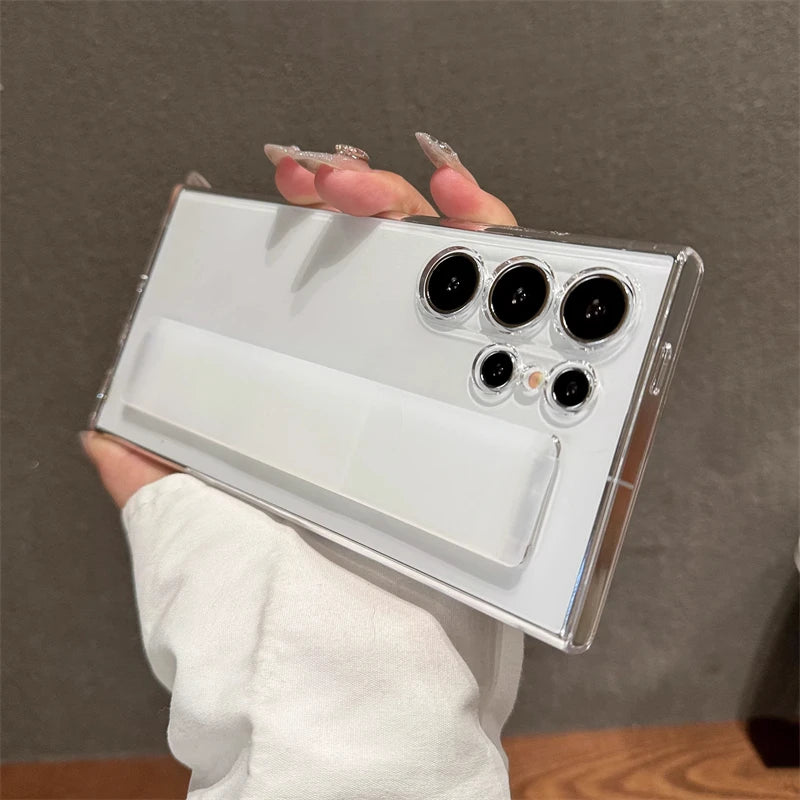 This luxury case is designed with an ultra-thin and shockproof PC hard clear cover. It also features a matte elastic silicone wrist strap for added convenience. The perfect combination of style and protection for your Samsung S25 Edge S24 S23 Ultra Plus.