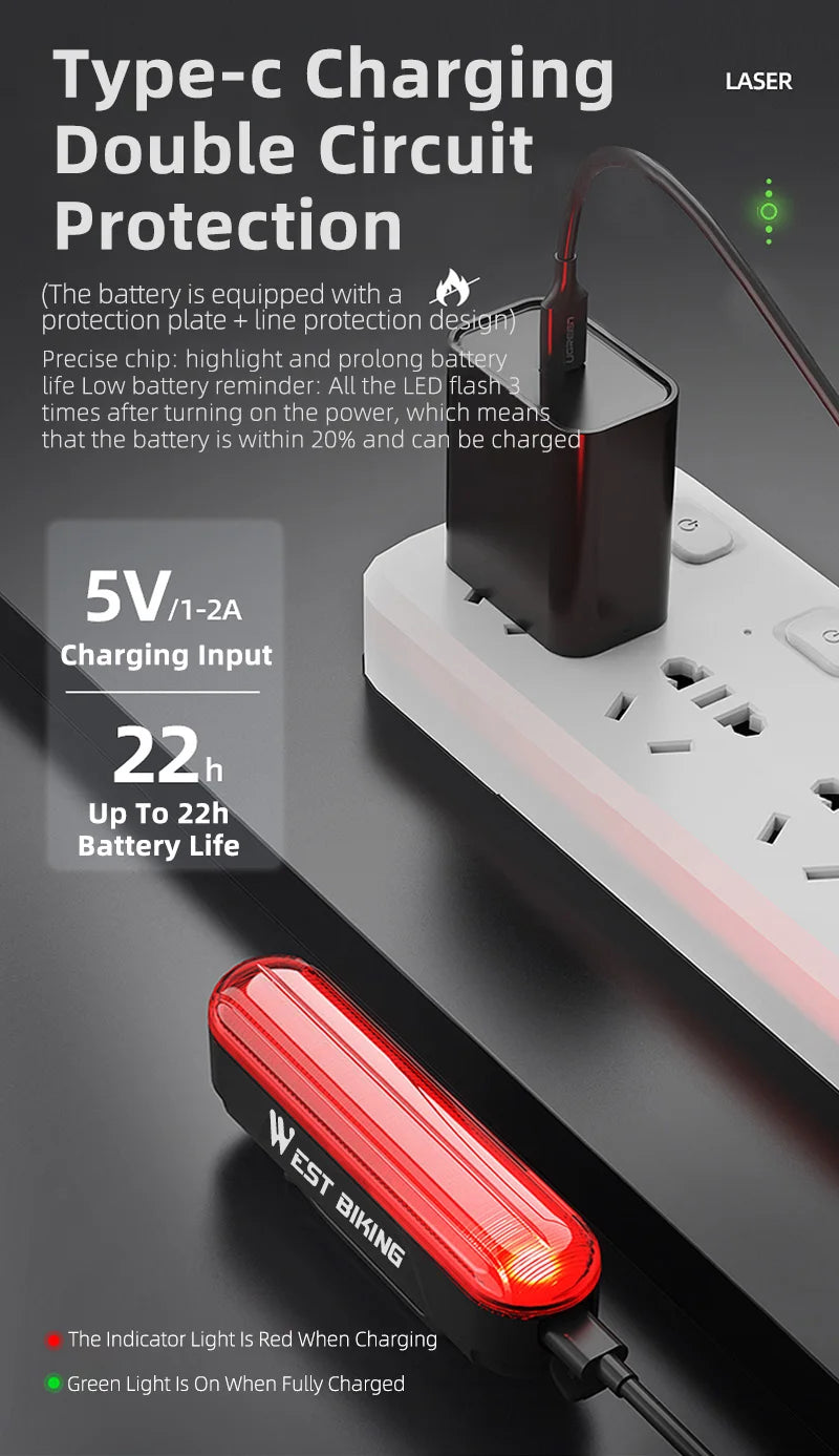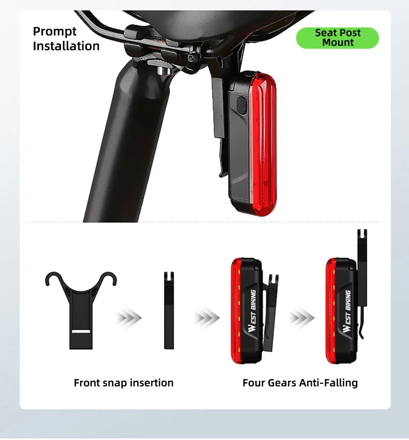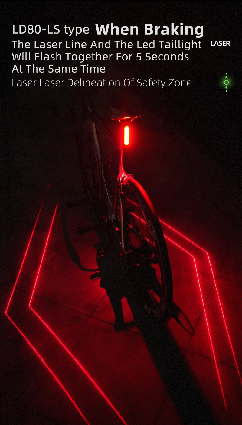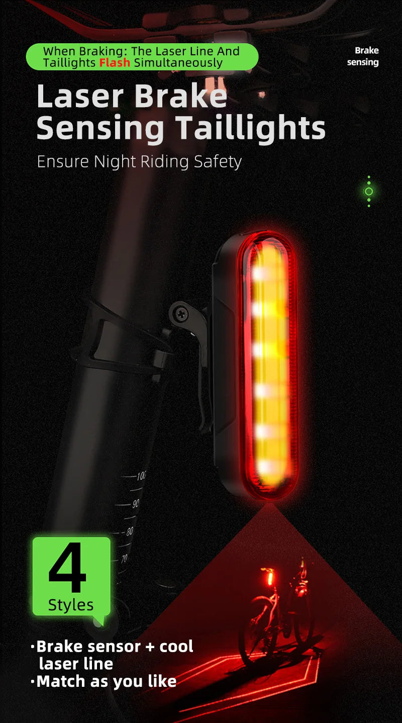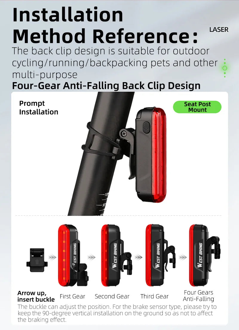 Increase your safety on the road with the WEST BIKING Bike Taillight Laser Brake Sensing Rear Light. This waterproof light features an innovative brake sensing technology and USB charging for convenience. Suitable for both mountain and road bikes, it's a must-have accessory for any cyclist.